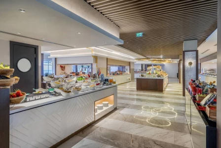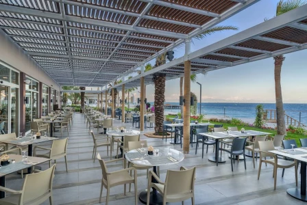 The hotel operates on an ultra all-inclusive formula, offering a wide selection of international and local cuisine. The restaurants serve à la carte and buffet meals, including: